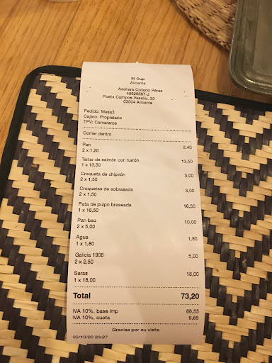Read moreTenía ganas de probar este restaurante por la originalidad de sus platos y desde luego no defraudó. En primer lugar la sala del restaurante es muy bonita, han creado un ambiente limpio, cuidado al detalle y cálido. En cuanto a la atención, de diez, te sientes bien atendido desde el principio hasta el final. Este es un detalle que no muchos restaurantes tienen, tratando al comensal como un simple número. Se nota que el Cup quieren hacer las cosas muy muy bien y esto se reconoce enseguida. Y en cuanto a la comida decir que nos encantó todo lo que pedimos, desde la ensaladilla de confit, pasando por las albondigas asiáticas que están deliciosas, la patata trufada, los lomos de sardina marinada y ajo blanco hasta el postre (pedidos la tarta fina de manzana). Todo exquísito y con la mejor relación calidad precio, además son platos tradicionales revisitados con el mejor de los resultados. Las raciones son óptimas, ni de bocado ni exagerado en cantidad. Con lo cual, deseando volver y seguir probando y descubriendo otros platos de la...