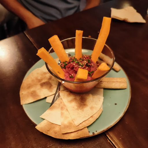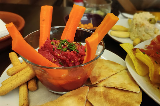 Eramos 3 fuimos a tapear por la noche, el lugar es super bonito con muy buena música, lo mejor es reservar porque no es muy grande y se llena pronto. De beber tomamos vermut casero, muy rico de sabor y no tan amargo, unas buenas aceitunas, refrescos y una copa de Tarima Hill blanco Chardonnay que estaba buenísimo. Para picar pedimos dos raciones de tortilla, poco cuajada y super sabrosa, nos encantó. Un hummus de remolacha que viene con zanahorías para dipear y unos triángulos de algo tipo tortilla mejicana, el sabor muy fresco y bueno. Luego unas patatas con jamón serrano, huevos y pimientos del padrón (yo no las comí pero la pinta era estupenda). Por terminar unas quesadillas con miel, mozzarella y sobrasada que están de muerte, y otro acompañante tomó un entrepan de ternera, canonigos y más ingredientes que se me escapan ahora, pero tenía un aspecto delicioso. El ambiente es muy chulo y animado, la atención estupenda, el que supongo que es el dueño, muy simpático y atento, nos ha explicado super bien la carta. Gastamos alrededor de 15€ por persona repitiendo bebida algunos, la comida es casera con un toque original y tiene buena carta de vinos y cervezas, nos gustó mucho la música también y seguro que haremos otra visita para...