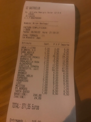 Edito para contestar a la respuesta del local, que viene después. "David no ofreció invitación". No he afirmado eso, si contestan cosas que yo no he dicho, mal vamos. He escrito "ha ido preguntado uno a uno, ya yéndote del local y con la cuenta pagada". Insisto en que nos estábamos yendo y un camarero viene a preguntar qué queremos tomar. Concretamente yo no había pedido nada y me dieron a elegir entre dos tipos de licores, como hacen en cualquier sitio cuando alguien deja buena cuenta, que le ofrecen algo fuera de la cuenta, que además ya estaba pagada. Qué sentido tendrá que paguemos, nos estemos yendo y nos retengan para preguntarnos qué tomamos y nos lo cobren. Un cliente dijo que "él se hacía cargo de las consumiciones". ¿De qué consumiciones se habla aquí, si nos estábamos yendo y acabábamos de pagar? ¿De las que nos preguntó el camarero que qué tomábamos? Porque nadie pidió nada, nos preguntaron a todos y nos dieron a elegir entre un licor u otro. Eso no es pedir nada, eso es que me ofrezcan. Ahora, provocar esa discusión por 30 euros, después de gastar 1.200 y poniendo como excusa que alguien tenía una tarjeta de crédito, pues dice bastante de la actitud del propietario y de su mala visión de negocio y don de gentes. Perder 30 miserables euros (mucho menos porque ocho chupitos no le cuestan eso al restaurante) te hace quedar como un señor. Invitar a algo cuando se gasta 60 euros por cabeza hace que se ahorren discusiones y se ganan clientes. Así los...