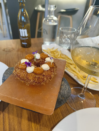 Read moreCocina tradicional y de fusión con un toque de cocina de autor muy original y sorprendente. Nada más probar las croquetas de lomo ibérico de rebozado perfecto y un interior cremoso cuyo sabor explosiona en la boca, entendí que las pretensiones son estar a otro nivel. La reinterpretación de las patatas bravas en forma de donuts rebozado con la crema de patata interior y las salsas por encima, aparte de original es magnifica. Otro plato atrevido y diferente que probamos, el tallarín de calamar con boloñesa, una tira muy fina de calamar marinado con la típica salsa italiana, plato muy bueno aunque es cierto que en la mezcla se impone por mucho la boloñesa sobre el calamar. La interpretación de pepito con queso ahumado y salsa también original, diferente y rico en sabores y matices pues todos los sabores están (carne, queso, mantequilla, etc) pero ninguno se impone sobre los demás. En postres, torrija con helado de Fondillon, magnifica, la tarta de queso con helado de Baileys, estupenda. El soufle de chocolate con helado bueno de sabor pero no se porque lo de soufle pues no tiene la textura del mismo. Lo vinos, tanto blanco como tinto buenos y sin pasarse en el precio. Detalles como el pan de mesa, muy bueno, denotan que quieren estar a la altura en todos los detalles. Local muy bien decorado sin sensación de agobio entre comensales. Sin problemas para aparcar. Repetiremos. De momento 100%...