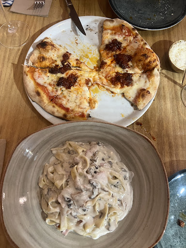 Read moreNos sentamos aquí porque teníamos el apartamento justo al lado pero aun no podíamos entrar. Éramos mi mujer, mis hijos, uno adolescente y 2 pequeños y yo. Las pizzas normalitas y con "poca chicha"...la prosciutto de mi hijo apenas si llevaba algo de jamón Pero lo peor es que en la carta anunciaban varios platos de carne diferentes, tanto de ternera como de pollo y al pedir resulta que solo tenían un único plato de carne, el osobuco, que, curiosamente, era el mas caro de todos ellos. Al final lo tuvimos que pedir para mi hija, pero no era lo que queríamos.