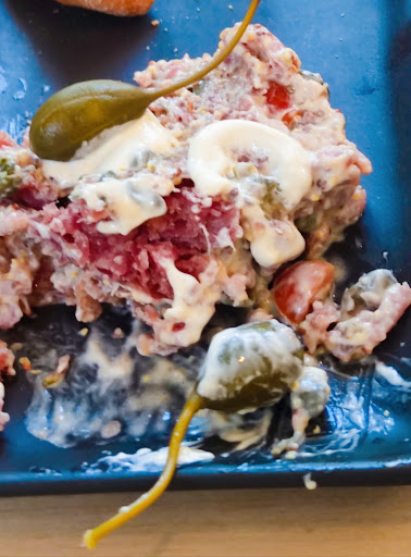 Nos traen los primeros, tartar de fuet y lentejas, a cual estaba peor elaborado. El tartar sin más, lleva el nombre pero sin mérito de elaboración; algo que le puedes hacer en casa a tus invitados de acompañamiento con una cerveza. No para un restaurante. Por otro lado las lentejas insípidas y sin gracia, el picante(jalapeños) que llevaba en exceso no hacía, ni dejaba saborear un buen plato como podrían ser.