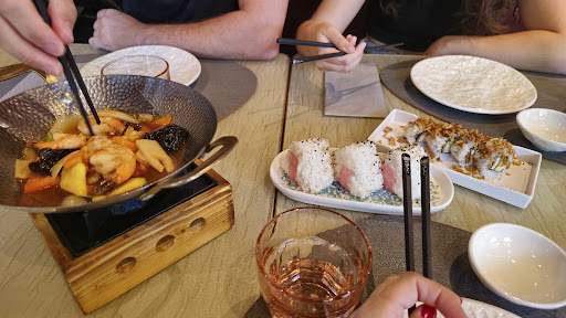 No suelo hacer reseñas negativas, pero la sensación ha sido de decepción por varios motivos, unos más importantes que otros. El LOCAL REALMENTE BONITO, grande, moderno, da muy buena sensación al entrar. El PERSONAL AGRADABLE en general. Nos sientan en la mesa 66 en el pasillo de la barra del fondo... Si no es la peor mesa, estará cerca de serlo, no por la ubicación, sino porque hemos tenido literalmente cada 10min aprox. PARADO JUNTO A LA MESA EL CARRO DE LOS PLATOS SUCIOS, ya que lo vacían ahí. El sistema de pedidos muy cómodo, pero el SERVICIO entre platos MUY LENTO. Anuncian mucha variedad de platos, creo que más de 150, pero en realidad, sobretodo en sushi, muchos llevan los mismos ingredientes pero montados de forma distinta, con lo que el sabor es el mismo, además de NO DESTACAR NINGUNO POR SER REALMENTE SABROSO. LAS PIEZAS SUPER PEQUEÑAS. Si hubiera estado realmente bueno y la variedad de platos fuera real, podría haber sido un punto a favor para poder probar más, pero no es el caso. LO PEOR DE TODO ha sido ver (ya que desde mi sitio se veía también la barra desde donde salen los platos) como al salir una bandeja con varios platos, cada uno con un papelito de la mesa a la que corresponde (en algunos en un lateral bajo el plato, en otros apoyado sobre la comida), varios papelitos se han volado al suelo y tranquilamente LOS HAN COGIDO DEL SUELO y los HAN VUELTO A UBICAR JUNTO/SOBRE LA COMIDA. PRECIO ELEVADO en comparación con otros restaurantes buffet de este tipo que sirven platos mucho más sabrosos.