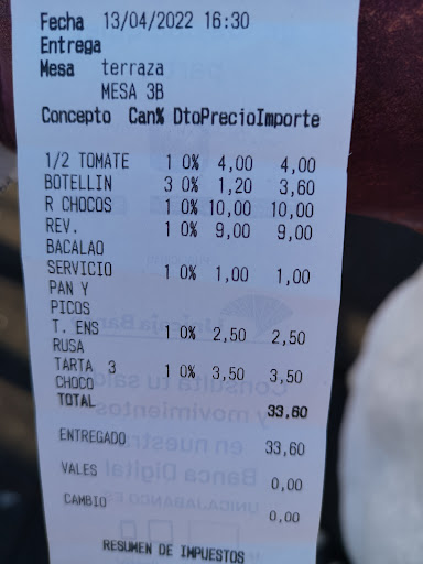 Me aseguraron que la ensaladilla de gambas, tenía gambas, aunque parece una pregunta tonta no lo es,pues ya me pusieron surimi, solo con mayonesa de gambas,etc. Este al final era con trocitos de langostinos. No estaba mala pero no es lo que prometen. Tres platos de presa de paleta que pedimos, salados como perros. Tampoco gustó un postre de mouse de turron,com poco dulzor parecia a esa manteca de avellanas americanas, pero bueno eso ya es más...