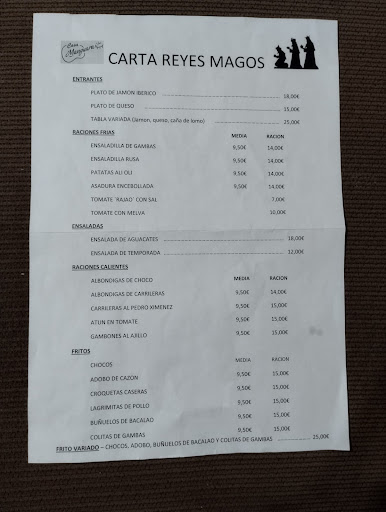 Por ejemplo, si nos fijamos en la sección "Fritos" vemos que productos como el choco y el cazón han pasado de 6.50€ media ración y 11€ la ración entera (con IVA), a costar 9.50€/15€ SIN INCLUIR EL IVA. Otro de los productos que solemos consumir, la presa, ha subido también de 14€ (con IVA) a 20€ (sin IVA)... Y así con TODOS los productos de la carta, únicamente por ser día de Reyes.
