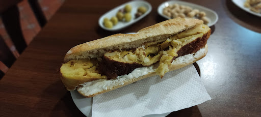 Almuerzo para 3 personas por 17€: 1 bocadillo entero de patatas y huevo, 1 medio de tortilla y ajoaceite y 1 medio de carne y pimiento. Copa de vino y cerveza para beber y 3 chupitos. Olivas y cacahuetes cortesía de la casa.