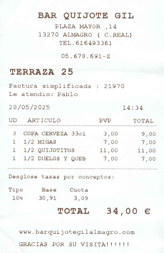 Read moreLo bueno de probar sitios nuevos es que si te gustan repites, no será este el caso por mi parte. Pedimos varios platos para compartir, raciones y medias raciones, una de bacalao, caro para lo que te sirven, tres trocitos que costaba encontrar entre tanto rebozado acompañado de pisto, jamás lo probe más amargo; chipirones duros como suela de zapato, pedimos repetir pan, cuando lo trajeron la comida se había enfriado, dos trozos duros que no eran del día (ni de ese ni del anterior), falta de profesionalidad total por parte del camarero cuando se lo hicimos saber nos informa del nombre de su proveedor de panadería y de que están probando a hacerlo de esa manera ¿De qué manera? ¿De no tener previsión de las existencias necesarias? Ahí no queda todo, nos dice que es un "tío muy sensible" y que lleva mal las críticas, lo primero que pensé es que saldría una cámara oculta desde algún punto de la plaza, jamás me ocurrió algo tan surrealista en ningún negocio de hostelería de los que he visitado en mi vida. No entendí nada de su reacción ya que nuestra reclamación era justa y por supuesto respetuosa. Lástima que con la cantidad de estupendos locales que hay en la bella localidad de Almagro esta vez pinchamos en hueso (o en...