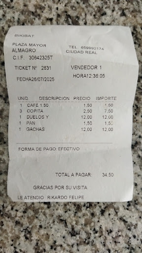 Read moreHemos pedido duelos y quebrantos, y gachas, los platos manchegos no son lo que deberían ser, están mal ejecutados, falta de ingredientes. No recomiendo. Tampoco tienen aseos. ACTUALIZACIÓN, Respuesta propietario: como ve tengo el ticket que demuestra que hemos estado en su bar. Las gachas estaban insípidas, tuvimos que pedir sal, a parte que tenía trozos de harina, llevaba un trocito pequeño desmenuzado de chorizo y le faltaba la panceta. Los duelos y quebrantos les faltaba el chorizo y los huevos estaban muy cuajados, además que se le echó pimentón. Esos platos los comimos en más sitios y es tal cual la receta. Y lo de los aseos, entró mi marido preguntando al camarero y le dijeron que no tenían. Usted verá, si lo platos estaban mal elaborados y con falta de ingredientes en platos típicos manchego que se supone que lo tienen que hacer bien, igual el problema era del cocinero ese día, yo que sé. Si los platos hubiesen estado bien ejecutados le pondría una buena reseña pero como no es el caso le pongo lo que...