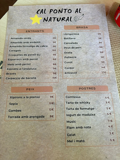 Tal i com diuen els seus propietaris, o t'agrada o no t'agrada, i a mi particularment m'agradat. Un lloc on has d'anar sense presses i gaudir de l'àpat. Amb això no vull dir que siguin lents servint, però tot flueix a un ritme diferent. Els caragols boníssims i abundants. Les caragolines amb samfaina també molt bones, però un pel caldoses per al meu gust. Un carpaccio de bacallà magnífic i un xipirons arrebossats bons. Les potes de porc a la brasa molt encertades i ben cuinades i el conill a la brasa al punt. Postres bons. El servei és proper i atent. La relació qualitat preu és excel·lent. Si vols gaudir d'un àpat en natura i bó aquest és...
