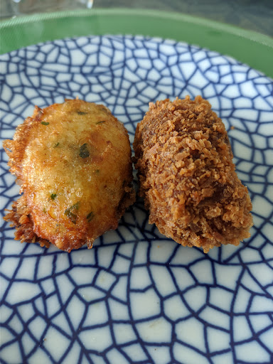 Vam prendre un menú per 70€ maridat amb molt bon gust amb vins. El menú incloïa 3 aperitius, 4 entrants, 1 plat principal, postre i cafè. A destacar les cinq preparacions de les fotos: Croquetes cassolanes de bacallà i de putxero, boníssimes Canutillo de butifarra i poma Navaixes amb pernil ibèric i triguero, el marisc era d'una qualitat altíssima Gaspatxo de dacsa amb textures, fresquet, original i molt rico Fideuà amb rachà, llangostins i polp. Tarta pavlova amb herva sana, la qual denotava una tècnica molt pulcra per a la reposteria.