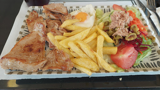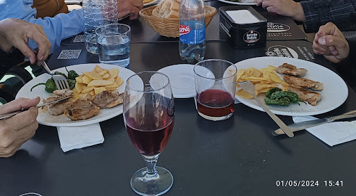 Read moreSitio tranquilo, con una gran zona de aparcamiento. Íbamos el 1 de mayo con nuestros dos perros y paramos a comer aquí porque tenía terraza. El personal fue muy amable. Eramos 6 y enseguida nos juntó 3 mesas, aunque habría sido suficiente con dos. Tenian menú, (aunque no escrito) a pesar de ser festivo. Nos ofreció de primero arroz negro, revuelto con espárragos y gambas o ensalada mixta. Todo estaba muy bueno. De segundos merluza a la plancha con salsa, secreto o pechuga de pollo con salsa de pimienta. Los segundos llevaban guarnición de verduras (pimientitos, berenjena...) y patatas. También todo muy bueno. De postre tenían flan casero, pudin, tarta de manzana con helado y tarta Lotus, también todo muy rico. Algunos tomamos café y otros postre. Luego nos ofreció unos chupitos para los que no conducían. Nos cobraron el menú de festivo a 15€ y el medio menú (de segundo plato) a 10,50. Nos cobraron las...