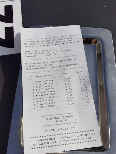 Read moreEs imposible comer peor y más caro. Y el que parecía el dueño, no puede dar peor imagen del local. Fueron muchos los malos detalles. La comida de mala calidad. Cuando digo que los torreznos huelen mal, en lugar de olerlos me dice que nadie se ha quejado. La carne "a la brasa" aceitosa, con aceite de mala calidad. Las patatas fritas frias. La verdura a la brasa. quemada y cruda por dentro. Una sepia a la plancha, que debieron hacer en la misma sartén que la carne, aceitosa y chamuscada