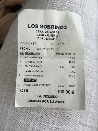 Read moreA un amigo y a mi nos intentaron engañar. Al principio un trato excelente. Comimos un amigo y yo, somos de fuera de Almería así que nos debieron de ver pinta de turistas. Nos informaron de que las tapas iban con la bebida, así que pedimos 2 bebidas con tapa y otras 2 tapas aparte. En la carta se ofertan una serie de platos, entre ellos parrillada de pescado y costaba 5 euros, y pedimos una para compartir. Nos trajeron la bebida y tapas y una bandeja enorme con mucho pescado (emperador tintotera y atún) y marisco (chirla mejillón 2 gambones y 2 cigalas. Nosotros nos quedamos un poco mosca, pero bueno, imaginamos que había puesto la de marisco (en la carta 8 euros). A la hora de pedir la cuenta nos habían cobrado la bebida, 5 tapas (aparte sólo pedimos 2) y 40 euros por la bandeja (aparecía como parrillada de Pescado x 2, así que 20 por 2 cuarenta). Nosotros nos enfadamos porque no habíamos pedido ese plato, habíamos pedido una parrillada de pescado que valía 5 euros, que era lo que estaba señalado en la carta del bar. Los camareros se pusieron bordes y al final nos dejaron pagar 25 euros y adiós. Eso si, comimos de lujo pero no repetiría en un sitio que engaña a sus clientes o que comete errores y no los asume. Muy decepcionante porque íbamos recomendados y teníamos buenas...