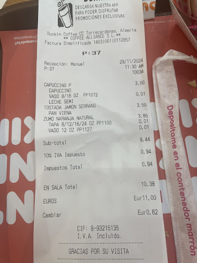 Read moreTotalmente descontento con el establecimiento situado en el Centro Comercial Torrecardenas. Para empezar las mesas sucias y nadie sale a limpiarlas. He tenido que vaciar las bandejas yo mismo y limpiar la mesa para sentarnos. Y para colmo pedimos un Donuts y un café (que van juntos con un descuento en el precio) y nos lo obran por separado y encima nos sueltan que tenemos que decirlo al pedirlo porque los camareros son nuevos y no se enteran. Me parece una vergüenza. Espero que Dunkin España tome medidas. Y por supuesto que no vuelvo más a este...