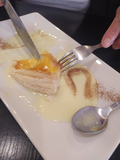 De postre ( que entraba en el menú) milhoja de manzana y tarta de chocolate. Nos correspondían 3 postres, pero uno no lo pedimos porque sino reventamos 😁