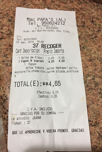 Read morePues nada ya veo que está empresa se lo gana a pulso por lo que estoy viendo en las reseñas. Pues enga otra más a continuación contando mi gran experiencia. Pedimos 3 papas asadas a las 21:50 y nos dicen 40 minutos. Nosotros decimos que es mucho tiempo pero que ok. A las a las 10:45 llamamos que que pasaba que no venían las papas y que ya había pasado casi una hora. Nos dicen que él repartidos había salido y que ya estaba a punto de tocar en la puerta. Pues bien ni repartidor ni leches. A las 11 de la noche le decimos que donde estaba el repartidor que aquí no había nadie y que era mentira lo que nos habían dicho. Pues contesta no te preocupes que en un momento está hay. A las 11:15 volvemos a llamar y seguíamos con las mimas ya casados de y mosqueados. Nos aparece el repartidor a las 11.28 minutos. Casi 2 horas después y con las papas ya malísimas , asentadas y frías. Muy mala experiencia que no va a volver a ocurrir...