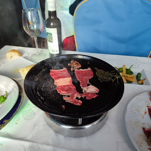 I took a friend for her birthday. It was the first time I had been. The tables all had white linen. Fresh cutlery with each course. Waiters very smartly dressed and attentive. We order un surtido de carne por la piedra along with a house salad which was delicious with fruit amongst the salad leaves. The meat you cook yourself at the table. Cost was 12 euros for the salad and 20 euros each for the meat. Un tercio de cerveza 2,50, water 3 euros. Total bill 67,50 euros for 2. I'd go again for a...