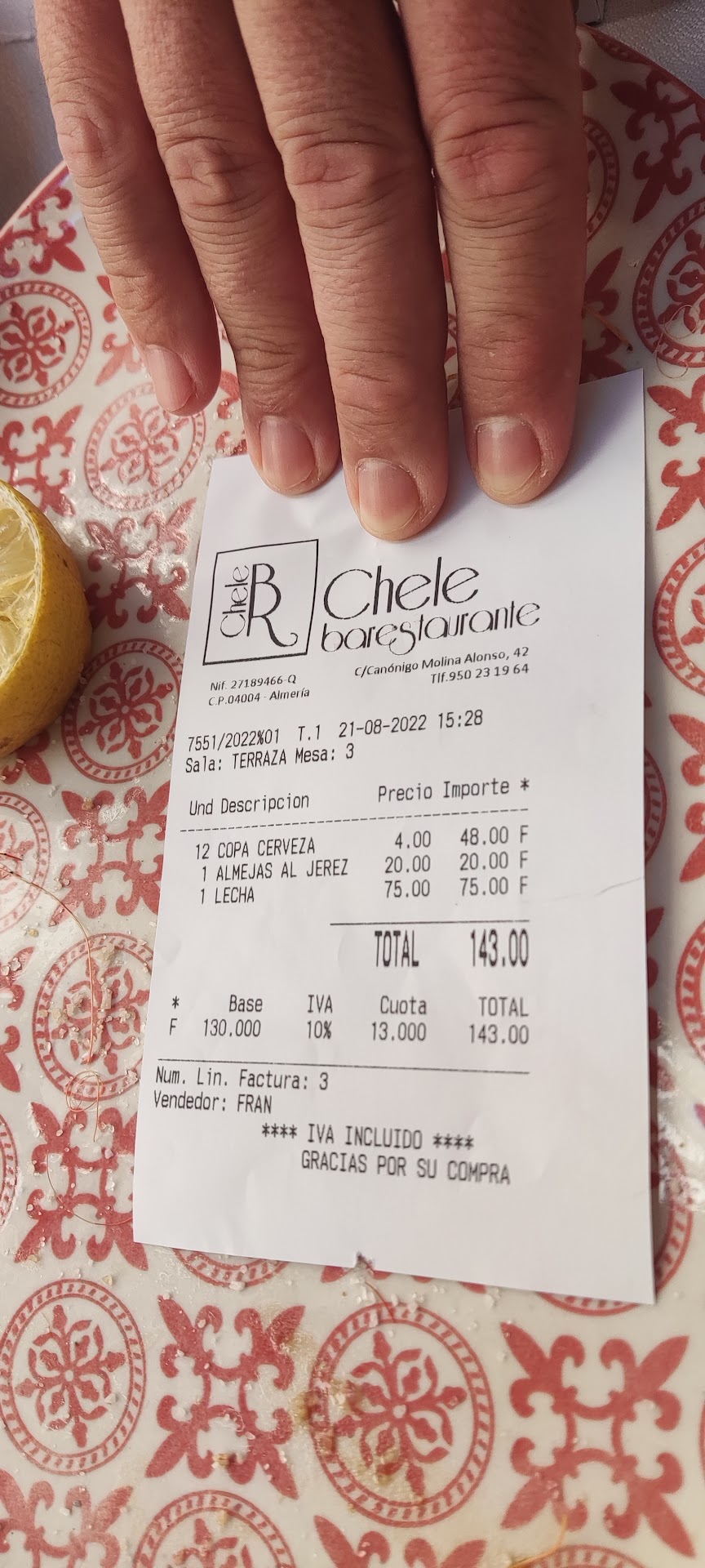 Read moreFuimos a este restaurante con más miedo que Spiderman en un descampado... Pues al final se cumplieron los pronósticos, la copa de cerveza a 4€ con una tapa de pequeño tamaño posteriormente nos ofrecen pescadito y chulos nosotros nos pedimos una lecha (pez limon) miramos el precio y nos pareció razonable el precio del kg. Para compartir... Ante nuestra sorpresa antes de decirnos el peso del pescado que queremos nos traen la bandeja de lecha (de cantidad estaba normal) frita y a la plancha. Muy rica por cierto. Y para engrasarnos, porque sabían lo que nos iban a meter en la cuenta, un platillo de gambillas blancas gratis. Al final fueron 75€ por la lecha, en la cuenta final sin especificar el peso del pescado, ni el precio del kg. Genial 👌👌 (ironía modo on) me gustaría que en lo sucesivo me dijeran el peso de lo que me como para hacerme así el cuerpo..... así salimos los 4, andando como cowboys. Me gustaría más claridad en lo sucesivo en los bares y restaurantes de la ciudad, puesto que así lo único que hacen es perjudicarse asi mismos y evitar que salgamos con dolor en la zona que acaba mi espalda. Dejo imagen de la cuenta....