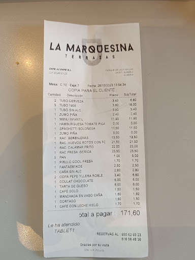 Read moreMenuda vergüenza de bar lamentablemente la atención por parte del camarero con gafas negras bastante déspota y habia que repetirle las cosas 100 veces pero eso es lo de menos lo lamentable es la cuenta Raciones de vergüenza una ración de calamares con 10 calamares y repito ración entera 22 euros una cerveza 3euros con 40 céntimos sin tapa 3 euros con 40 céntimos sin tapa me parece vergonzoso y de tener muy poca vergüenza y de querer aprovecharse de las personas ahora pondré el ticket para que se vean los precios de vergüenza insisto no volveré jamás no lo recomiendo para nada 43 por persona éramos 4 personas 43 eurazos por irte con hambre del bar me siento estafado en la Gruta sale más barato comer pero bueno yo he escogido el sitio y me la como doblada Y otra cosa indignante es que una vez que hemos pedido las raciones y comido todos seguíamos con hambre dado el tamaño de las raciones no te dejan pedir ni una sola tapa se lo he dicho al camarero que nos ha atendido y me ha dado un rotundo no tal cual (no) Lo puedo entender por qué te lo dicen cuando reservas pero es que al ver el precio de la copa de cerveza ( copa normal no es ninguna locura ni medio litro ni nada parecido ) 3'60 € por una copa de cerveza me parece una burrada jamás me habían cobrado semejante barbaridad por una cerveza no me pongas tapa pero no me cobres la cerveza ha ese precio En fin una mala experiencia y muy frustrante da rabia salir a comer y...