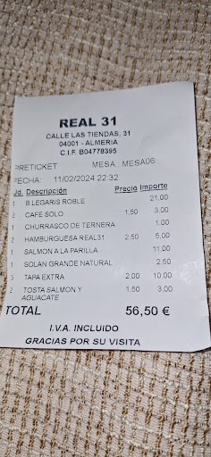 I want to bring attention to my recent disappointing experience at Real 31, marked by unjust overcharging practices. Despite ordering a dinner meal, purchasing a 21 euro bottle of wine, and paying for tapas, I was shocked to discover an additional 10 euros charge for "extra tapas" that were never served at my table. Importantly, it's worth noting that throughout my visit, I wasn't served any complimentary tapas, a departure from the customary practice in the region.