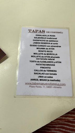 No puedo decir que mi experiencia en la Taberna Torreluz fuera exactamente lo que esperaba. Si bien el ambiente es acogedor y el servicio es amable, la calidad de algunas de las tapas dejó mucho que desear. Librito de camembert: Pedí este plato pensando que sería una delicia, pero lamentablemente la calidad no estuvo a la altura de los 4 e que cobran por una tapa que en Almería suele ser de cortesía El camembert no estaba bien elaborado y el pan que lo acompañaba era mínimo , la carne de mala calidad chiclosa con ternilla . No vale la pena el precio que pagué por él. Pero cabe destacar que La taberna tiene un ambiente cálido y acogedor que invita a relajarse. Y : El personal fue amable y atento, aunque podría mejorar. Recomiendo Mejorar la calidad de algunas de las tapasAlgunas tapas, como el librito de camembert, necesitan una revisión en cuanto a ingredientes y preparación. *Atención al detalle,Asegurarse de que todos los platos estén bien preparados y presentados antes de servirlos… ya que las almendras del jamón estaban duras y el bellota calidad básica con muchísimo tocino