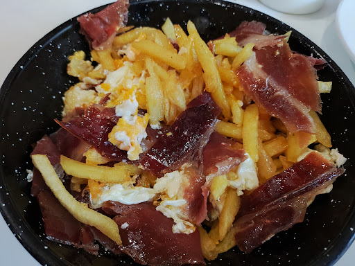 Read moreBar con terraza exterior y pequeño salón interior con pocas mesas. La carta no es muy extensa. Si tuviese que destacar algo de éste bar serían los platos de olla 🍲 típicos almerienses como el trigo, los gurullos, la berza y la jibia en salsa. Lo que he notado en general en Almería es que están acabando poco a poco con lo que la hacía diferente, con la tapa. Ya casi el 75% son tapas gourmet o premium, casi ni te preguntan por la tapa por si ni te das cuenta y no la pides, o si reservas no tienes derecho a ellas. Una verdadera pena que otras ciudades como Granada aún sí sigue con la tradición de la tapa. Y eso es lo que ha ocurrido también hoy, 2 cañas y un vino y he pedido una tapa premium porque el camarero ni me ha preguntado el resto de servicios. La jibia en salsa súper tierna pero un poquito salada, los huevos estrellados con jamón de Guijuelo, demasiado hechos por lo que al romperlos no había mucha yema y las patatas fritas congeladas, las croquetas de gambas cremosas, tenían de cremosas el nombre y las croquetas de jamón ibérico de sabor muy buenas pero poco cremosas. Si repito será uno de esos días de...