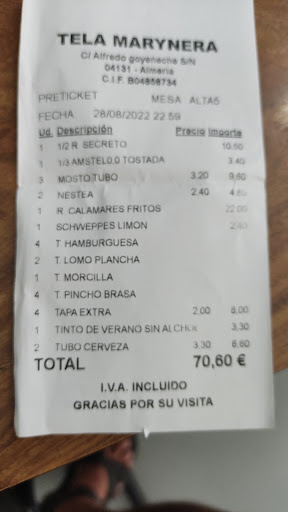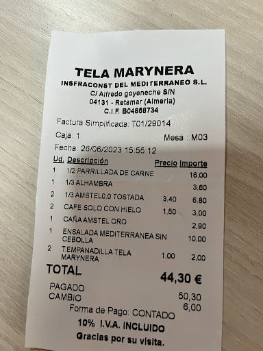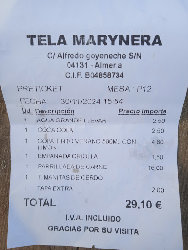 Read moreHoy al mediodía decidimos comer en Tela Marynera volviendo de viaje. Vivimos poco tiempo en Almería pero lo habíamos visto muchas veces al pasar y hoy fuimos por primera vez. La atención de los camareros correcta . Con la bebida nos ofrecieron de tapa sus empanadillas tela Marynera, grasientas y el relleno 90% de patatas y algo irreconocible 😞. Pedimos una ensalada ( 10 € ) bandeja muy grande con mucha lechuga de la normal, pero realmente fue lo mejor de la comida, porque pedimos media parrillada de carne ( nos dijeron carne variada, chorizo, salchicha etc) pero la gran sorpresa fue que la fuente trajera la carne en pequeños huesecillos suponemos que era costillas de cerdo de tamaño de medio dedo pulgar o menos, casi sin carne , y otros trocitos suponemos que era secreto de tamaño de una uña completamente secos e incomibles, el pincho moruno seco para romperte una muela que tampoco pudimos comer, un chorizo partido por mitad, una morcilla ídem y una salchicha, un pimiento tipo padrón, una rodajita de berenjena y una de calabacín ( 16 € ), el caso es que al recogernos los platos se lo comentamos al camarero que esos 4 CUATRO huesecillos de carne no era una parrillada, a lo que el vimos que se lo comentó a los supuestos jefes. Pedimos café con hielo y la cuenta. Total de la misma: 44,30 € Hasta las horribles empanadillas que se suponía que iban con la primeras cervezas nos la cobraron:: 2 € En resumen: hemos comido una ensalada con cervezas, el resto sin palabras, porque ni siquiera tuvieron el detalle de pedirnos disculpas. No somos turistas y ellos han perdido 2 clientes.UNA...