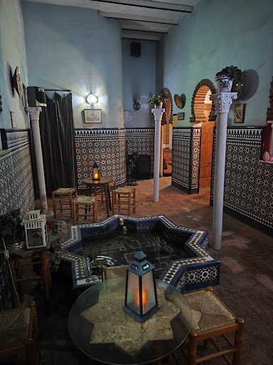El local es una antigua vivienda con techos altos y decoración árabe, con una fuente en el centro. También cuenta con salas para sentarse cómodamente en alfombras.