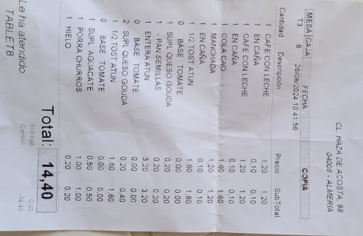 Read moreHe estado muchas veces y siempre estuvo genial, era algo elevado el precio pero merecía la pena. En mi opinión, ahora ya no y a las pruebas me remito. 2 cafés y dos medias tostadas casi 12 euros lo veo exagerado. Por ese dinero podrías pagar un menú completo muy decente, que llevaría mucha más cantidad de comida y preparación y por lo tanto costo y esfuerzo... Esto no... Y para no dejarnos indiferentes, el camarero que nos dió asiento, atendió primero a otra mesa de sanitarios que llegó más tarde y que desayunan todos los días allí. Me parece un poquito feo, más que nada por todo lo que tardaron en llegar las dos tostadas medias y ellos ya habían hasta terminado de comer... Lo siento pero no así no se trata al cliente y menos con...