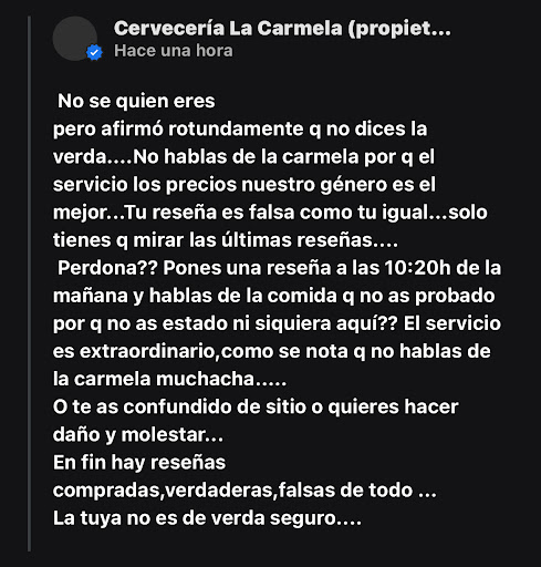 La dueña (la identificaréis porque siempre va con una cola, morena, baja de estatura y con un pañuelo en el pelo a modo “pirata”), me ha AGREDIDO y AMENAZADO verbalmente por preguntarle si podían limpiarnos la mesa, que estaba sucia de los clientes anteriores. Su repuesta ha sido amenazarme con tirarme al mar, delante del resto de clientes. Claramente esta persona no está en sus cabales para dirigir un negocio de cara al público en el que se le pide algo mínimo con educación y se lo toma como un ataque. Hemos pedido que nos devolvieran el dinero ya que no hemos llegado a consumir lo pedido y ya tiene su correspondiente denuncia penal por amenazas.