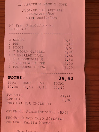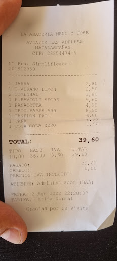 Read moreExperiencia regular,no sé si volveré.los precios bastante inflados para lo que ofrecen,una copa de cerveza 4e y pico y no venia fria,pedimos una presa,venia tipo folio,poco generosa,le dijimos poco hecha y vino pasada y mas cara que en ningún sitio de matalascañas.luego habia un plato en la carta que ponia que era carne por el nombre pero al parecer era algo de queso,se lo comentamos creyendo que habian puesto otro plato de otra mesa y la respuesta fue lo mejor,que si no sabiamos leer y entender lo que ponia no era su problema que habia traido lo que se habia pedido,pero esque que a continuación dice encima que suele pasar esa confusión a menudo con ese plato,jejeje.pero el remate final,lo peor de todo es el trato,unas confianzas y modo de dirigirse nada profesional ni adecuado,y respecto al trato del resto del personal horrible,gritandole y hablandole sin ningun repecto delante de los clientes.la comida tiene algunas cosas diferentes a lo que se puede comer por allí y fue rápido estando lleno el local.2 personas, 3 platos más la bebida unos 60 y tantos euros,el tickect me lo.quitaron una vez que...