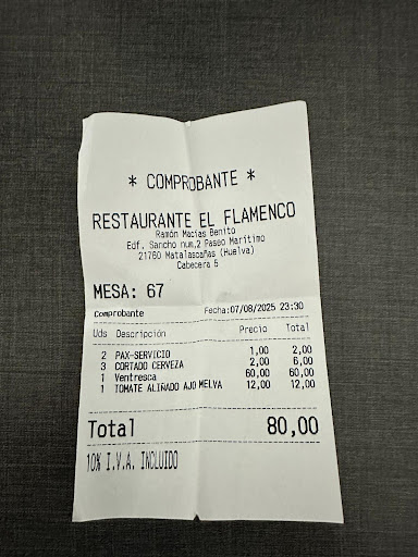 El ambiente del restaurante también es algo que merece ser mencionado. El Flamenco tiene un encanto especial: es acogedor, auténtico y con ese toque andaluz que te hace sentir como en casa. Las vistas al atardecer son espectaculares, y no hay nada mejor que acompañarlas con una buena copa de vino blanco bien frío.