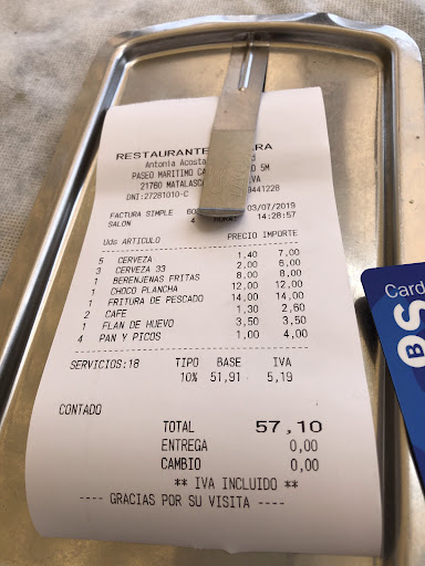 Read moreNo se puede decir nada negativo de ellos. Salimos encantados y repetiremos. ➕excelente atención por parte de los camareros y la propia dueña. Con recomendaciones y buen conocimiento del producto que ofertan. ➕genial para los 🐶, preguntamos si se podía entrar en la terraza y nos recibieron encantados con agua para nuestra mascota sin tener que pedirla. ➕producto: excelente relación calidad/precio. Muy bien trabajando y muy limpio (pescado y marisco). ➕precios: todo adecuado. Pedimos: choco a la plancha (servido con patatas, ensalada y salsita con AOVE, ajo y perejil), fritura variada (boquerones, acedías, choco y pijotas) y unas deliciosas berenjenas que parecían patatas fritas con miel de caña. El postre, un flan de huevo con gran sabor. Nos invitaron a unos chupitos de limoncello de Villa Masa. El pan estaba recién hecho, además incluye picos y regañás. Y todo ello a pie de 🏖. Muchísimas gracias,...