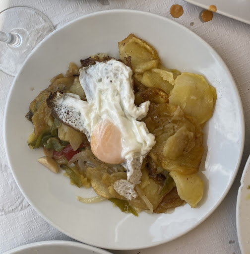 I had been glad to get the last table for Saturday lunchtime. The place was packed an the waiters got really busy. They were very professional but one more waiter would be a good investment especially as several tables had Bogavante con Arroz which consumes more time as every customer needs to be served individually. We came here as we knew that menu contains some very good vegetarian dishes (likely not on purpose): Salad with goat cheese and salmon (not very good), Salmorejo ordered without ham, Parillada de verduras (vegetables), Patatas a lo Pobre (Fried Potatoes and eggs with onions. We also had a very nice Bacalao with vegetables. The cheese cake was absolutely outstanding. Eben the bread was edible!! Despite being packed there was enough space for a wheel chair. I wouldn’t bring dogs on weekend. Overall the food was very good but with 85€ for 4 people without alcoholic drinks fairly expensive, what can be expected at a...