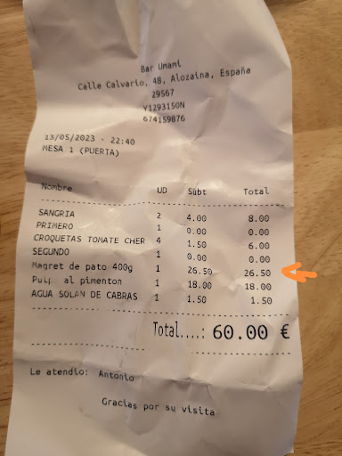 Food was great. Big portions. Very tasty. Expensive enough in Spanish terms but wurth it. Waiter was more interested in talking to the locals then servicing us. We were going to have desserts but because we were a. Fairly full (which is a good thing) b. He wasnt very reachable. As for the atmosphere. unfortunately that was ruined by the "local" drunk. Funny at first irritating very quickly. Luckly some other locals (very nice people) kept him at bay. When we wallked back we noticed that other places were a lot more busy. On the same road. Not sure if locals know about the issues we faced. Bottom line with some proper management this could be a top notch place.