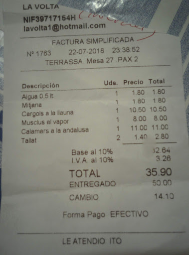 Excel·lent experiència a la terrassa de la Volta d'Altafulla. Vam sopar de meravella: Braves, Coca de cristal a los 4 quesos, Musclos al vapor, Cigalitas salteadas con puerro y flambeadas con vermut, Calamars a la andalusa Tot excel·lent. Com que veníem d'un viatge de Galicia, ja sabeu això de comparar el marisc amb el gallec... Excel·lent els escamarlans, les braves i els calamars, amb un arrebossat fantàstic pel finet. Molt recomanable, cal seguir tastant la resta de plats potser, això si una mica escassos.