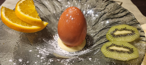 I el moment del postre va ser, senzillament, espectacular. Ens van servir una creació molt original: un ou de xocolata blanca, delicadament elaborat, farcit amb una mousse o crema de mango fresca i lleugera. A més de ser visualment impactant, el contrast de sabors era deliciós.