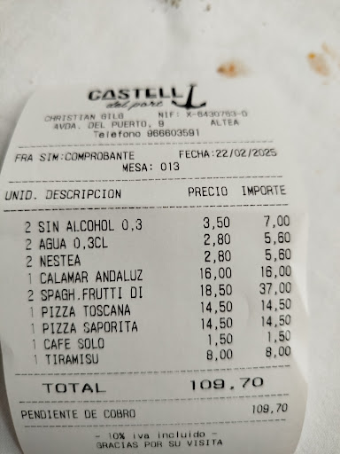 Read moreFamily meal, two adults, two kids 4 & 10. Authentic woodfired pizza. Pizzas were as good as any I've had from any trendy establishment in Manchester. Restaurant was very good, excellent atmosphere and very clean. Service first class. Waiter /waitress served our every need. We hadnt ventured up this far before but glad we did. I'd go as far to say this is the best, if only woodfired pizza in Altea.