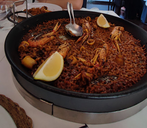 En cuanto a la comida fue un poco decepcionante, pero no por eso un suspenso. Pedimos una paella de calamares y cigalas, de sabor muy buena, realmente sabrosa, pero bastante salada, al poco rato el cuerpo ya te pedía beber agua, de hecho acabamos pidiendo otra botella. Además, algunas capas no estaban tostadas sino quemadas, para los que nos gusta raspar el arroz del fondo no fue una experiencia muy buena ya que distinguías la diferencia del tostado que tienen todas las paellas a quemado. Para un sitio de este nivel y que además está especializado en paellas no te esperas estos fallos tan básicos.