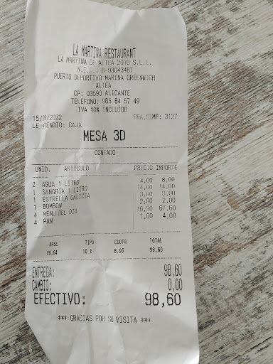 We visited La Martina on January 1 on the final day of three in the Greenwich Marina area. It was a quiet night in the restaurant and service was friendly and efficient from the server on duty. Our starters were Beef Carpaccio and warm Goat’s Cheese on Toast. Both were very good, although I’d have to say the raisins in the salad accompanying the goat’s cheese was unexpected and not to my taste - but I’m sure others will appreciate them. The main courses were Iberico Secret for my Partner and Spaghetti Carbonara for me. Both were excellent, the narrower, fine spaghetti used in my dish being a particularly nice touch. Spain knows how to produce and cook pork and the Iberico dish was both tender and tasty. A bottle of wine, a beer, a coffee and bread brought the bill...