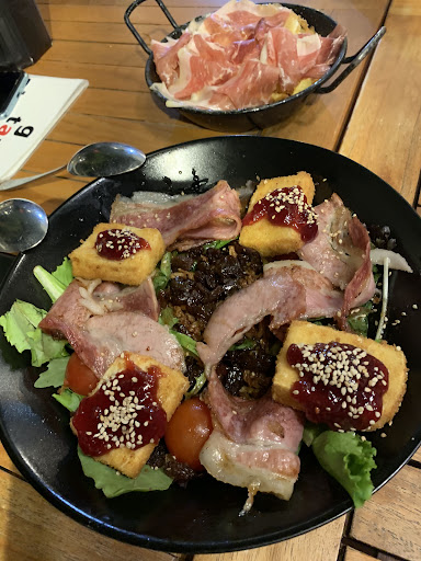 We came for a diner and drinks with the 3 of us. The prices are tourist area prices but you get good quality the service is very friendly and with a good dose of humour. There is an amazing atmosphere on this plaza and you feel like you’re eating in a fairytale.the ‘salad’ was great. It came with fried bacon and cheese so this was perfect for the unhealthy person that tries to eat salad. It was big and we shared it with 3. The solomillo is pork and not beef so that was initially a dissapointment but they tasted super. The wine was Gilda and is always nice. Super food, wine, location and service so a 5...