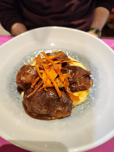 Read moreUn restaurante bastante amplio🍽️, con una zona de barra a la entrada con bastantes pintxos🍡🍢🥟 y tapas muy buenos. Tuvimos que esperar un pelín para comer porque tenían gente a un lado del comedor . Finalmente nos pusieron al otro lado solos y la camarera que nos atendió;una chica joven rubita, fue un poco despreocupada con nosotros. Nos atendió con prisas sin prestar mucha atención y se olvidaba de nosotros en varias ocasiones. Tuvimos que levantarnos para pedir la cuenta y pagar al final porque no venía. (Leímos un cartel de que buscaban camareras/os) y entendimos que podían estar un poco saturados pero dentro de la barra tenían varias personas y otro par en el otro comedor así que no se hasta que punto no era viable atendernos. En cuanto a la comida si que no podemos tener ninguna queja porque estaba todo realmente bueno. En especial el salteado de hongos🍄 con huevo poché🍳 y aceite trufado, las carrilleras🥩 y🥧 la tarta de queso que estaba...
