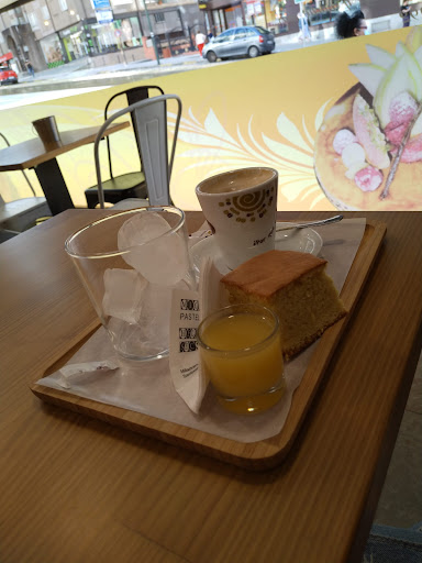 Local muy agradable en la mitad de la carretera general de Milladoiro. Es la típica pastelería con un café muy bueno y donde te podrías pasar la tarde charlando con alguien. Me ha sorprendido gratamente, que a pesar de haber ido a una hora por la tarde, nos ha acompañado el café con un bizcocho y un poco de zumo de naranja, algo que se suele hacer por las mañanas en los bares. A mayores, el precio no ha sido para nada caro, siendo 2,40€ por un cafe pequeño con hielo + un cafe grande. He quedado muy contento de haber elegido este local para tomar el café, recomendable.