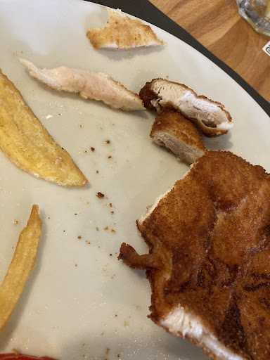 Muy decepcionada con la vez que comí de menú y el segundo que era pechuga de pollo rebozada me vino crudo y al devolverlo no me trajeron un trozo de pechuga rebozada nuevo, me trajeron el mismo trozo crudo que había cortado, refrito.