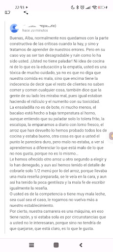 Respuesta 2: estoy perfectamente, como he dicho, retratados con lo del pollo y con la respuesta poco profesional. Me pregunto si siquiera alguno de ustedes tiene el curso de manipulación de alimentos. Por lo que veo en más reseñas ya que en la mía denunciada también comentaba que lo casero deja que desear vs lo que tenéis comprado mas la reseña de hace sólo un mes de alguien que se queja de vuestro escalope congelado veo que el rebozado es un problema generalizado para vosotros que en 3 años no ha cambiado. A ver si sois vosotros los que no vais a...