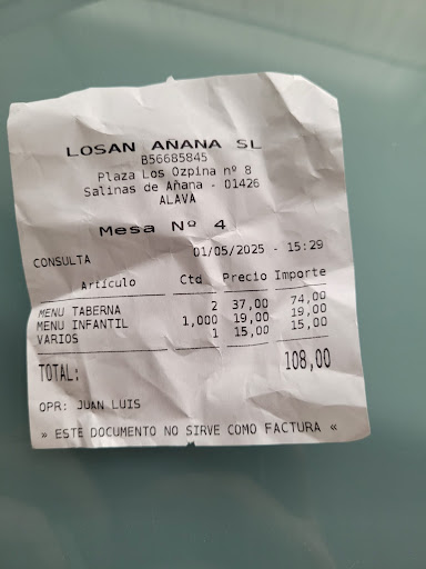 Hemos comido dos menus de 37 euros, MENU TABERNA, y dos menus infantiles. Los infantiles eran de spagettis + hamburguesa más helado 20€, y como uno era de un celiaco y le han puesto huevo frito con hamburguesa, nos han cobrado 15 € por el del celiaco, buen detalle.