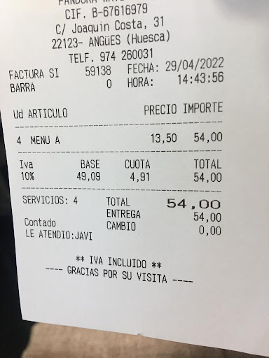 Buenas tardes. Ayer comimos en su restaurante. No estuvimos de acuerdo con la aplicación de dos precios diferentes: uno para los clientes habituales - 12 euros y otro para los clientes paso 13,50 . Fuimos educados con usted y le pedimos el libro de reclamaciones que ustedes se opusieron a entregarnos. Nos hicieron pasar dos veces la visa, y vuestra respuesta: " Si hay algún problema le devolvemos el importe Cobrado de más". Hoy mismo, viendo que no somos los únicos a los que usted aplicó precio diferentes, clientes que han comentado como nosotros sus anomalías en este portal, (local guide de Google). Procedemos a realizar una reclamación formal a través del ministerio de turismo Huesca con la intención de reclamar nuestros derechos como consumidores. Esta es la única forma de mostrarle nuestra seriedad, pues constatamos a través de su respuesta, una mala praxis con los clientes. Somos muchos descontentos con su sistema y negación a cumplir con las obligaciones impuestas por los organismos de consumo. Sentimos llegar hasta aquí, pero su comportamiento...