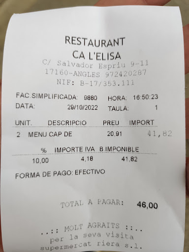 Read moreMuy buen sitio para comer en Anglès, comida tradicional, son muy amables, siempre está lleno, asique es mejor reservar incluso a veces con reserva hay que esperar. Muy amplia carta, y amplio menú, los fines de semana pica un poco el precio, sino recuerdo mal fueron unos 24 euros el menú. La verdad que todo está muy bueno, también se puede pedir para llevar a casa, siempre ha estado todo muy bueno, excepto hoy que hemos pedido medio pollo a la brasa, se puede escoger la parte que quieres asique pedimos dos muslos, pero se han equivocado y no nos lo han puesto y los macarrones estaban...