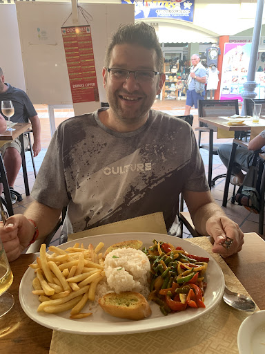 We received 4 slices of free garlic bread. Our starter garlic bread with tomato, had too much garlic for me. Very filling, lovely tomato. My husband had a 7.50 euro vegetable curry, massive in size with rice and chips and I had the spaghetti bol for 8.50. The fish looked amazing that the tablet had next to us.