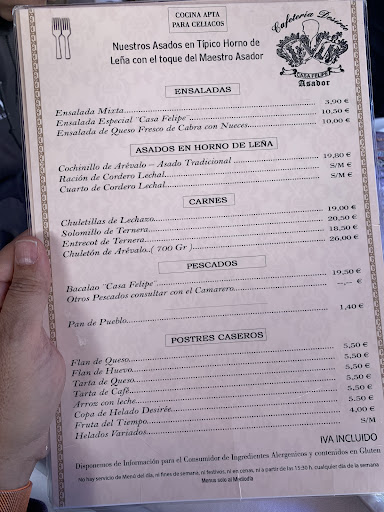 Read moreCasa Felipe: Típico restaurante asador de Castilla y León donde esperas encontrar un buen servicio, buena comida y un lugar agradable. Empezamos mal cuando pedimos la carta y menús y nos trajeron los dos menús más caros cuando habíamos visto uno a 16,50€ (el más económico). Cuando se lo comentamos nos trajeron a regañadientes dicho menú. Ya que había pocos restaurantes abiertos (por la COVID19 imagino) decidimos quedarnos ya que estábamos de paso. Me preocupa que sirvan la cerveza en una copa pequeña y un poco mal tirada la verdad. Daba para dar apenas dos sorbos. En cuanto a la comida, probé la ensalada mixta (típica, buena, las aceitunas podrían poner algunas más decentes) y los espárragos (4 y solo con mayonesa). Los segundos platos estaban muy buenos. El revuelto de morcilla con piñones y pasas excelente, las croquetas (caseras, buenas, pero eché de menos algún tropezón de jamón) y el filete de ternera empanado (muy bueno, tierno, pero con un exceso de aceite) acompañado de unas patatas muy bien hechas. El pan estaba incluido y estaba muy bueno. Finalmente, no nos dieron a elegir entre muchos postres, el único casero era "tarta de la casa" que al preguntar qué llevaba me contestó el camarero: nata y chocolate. Ante esta descripción (que podría ser cualquier tipo de tarta) decidí arriesgarme. En realidad era cuajada con una base de galleta y chocolate fundido por encima. Estaba muy buena, la verdad, la recomiendo. Si pongo una valoración tan baja no es por la comida, sino por la atención del camarero, el intento de engaño con el menú (que vimos que no fuimos los únicos) y por esa caña tan ridícula y mal tirada. Deberían mejorar el trato al cliente, aunque esté de paso y quiera comer un menú económico. Quizá vuelva para probar el cochinillo en otra ocasión con más tiempo, y espero que el...